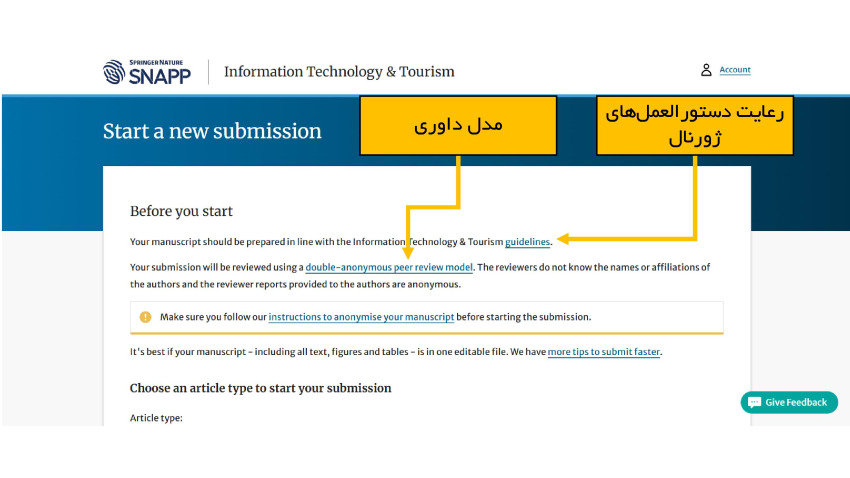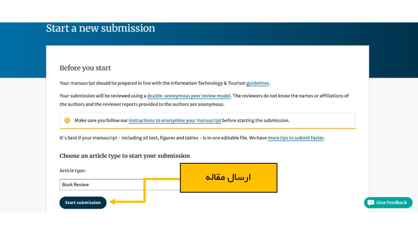 در این مرحله نویسنده وارد صفحه شروع ارسال مقاله (Start a new submission) میشود. پیش از هر چیز ژورنال توصیه میکند که مقاله مطابق دستورالعملها (guidelines) و مدل داوری (double-anonymous peer review model)آماده شده باشد.