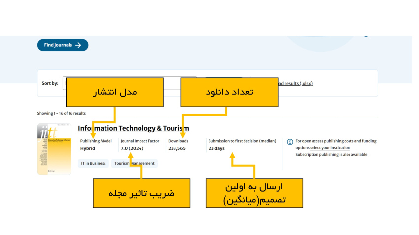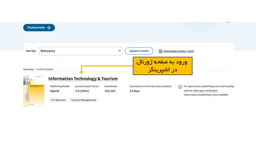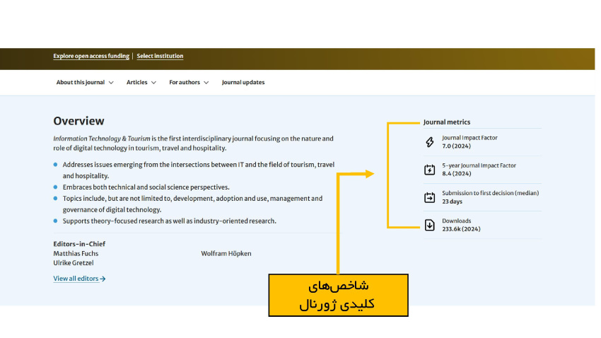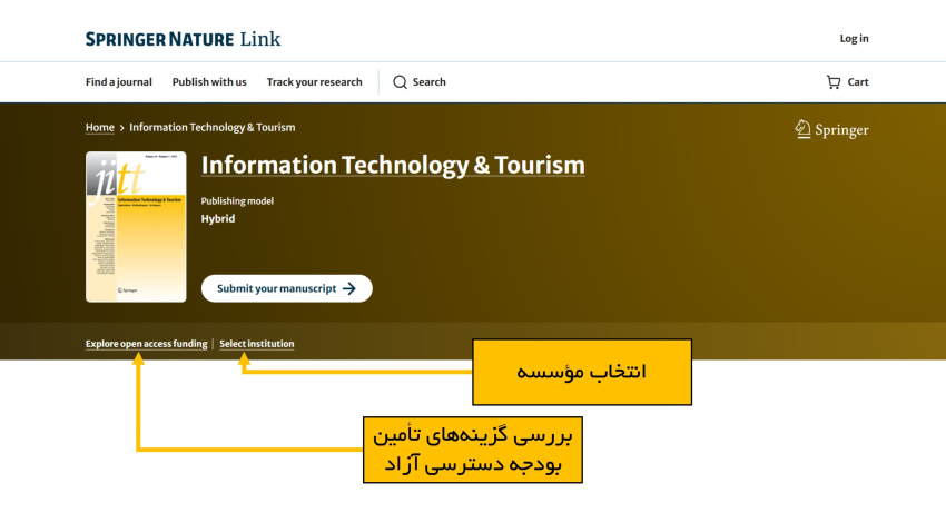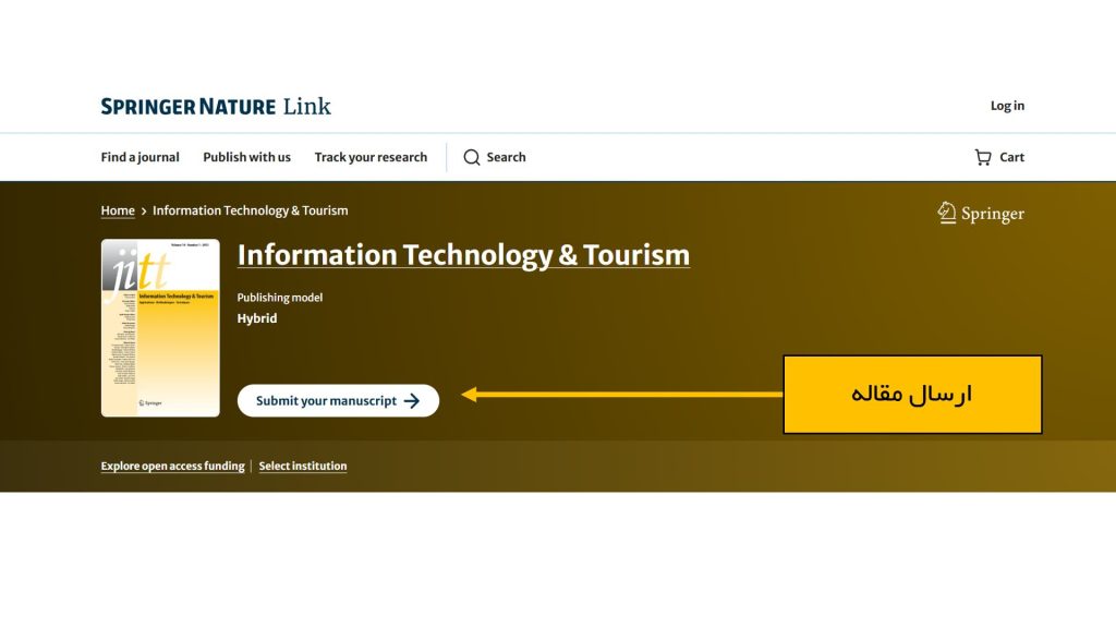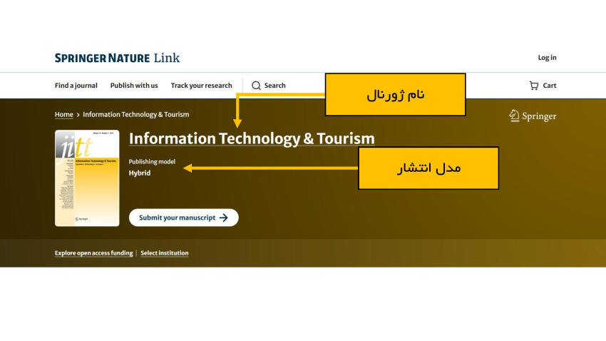 - مشاهده نام و مدل انتشار ژورنال: در بالای صفحه، نام ژورنال ( برای مثال، Information Technology & Tourism) نمایش داده میشود. در زیر آن، مدل انتشار (Publishing model: Hybrid) نوشته شده است که این عبارت نشان می دهد: