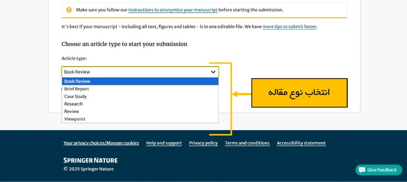 در این مرحله نویسنده باید نوع مقالهای را که قصد ارسال آن به ژورنال دارد انتخاب کند. فهرست ارائهشده شامل انواع مختلف مقالات مانند مقاله پژوهشی، مروری، گزارش کوتاه، مطالعه موردی و… است. انتخاب صحیح نوع مقاله اهمیت زیادی دارد، زیرا ساختار، الزامات و فرایند داوری هر نوع مقاله با دیگری متفاوت است و ژورنال بر اساس همین انتخاب، مسیر بررسی را مشخص میکند.