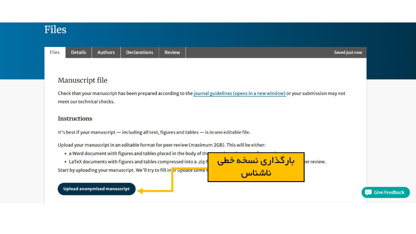 پس از شروع ارسال، نویسنده وارد بخش Files میشود. در این قسمت ژورنال تأکید میکند که نسخه خطی باید مطابق استانداردهای مجله آماده شده باشد و تمام متنها، جداول و تصاویر در یک فایل قابل ویرایش قرار گیرند. در این مرحله باید نسخه خطی بدون نام نویسندگان (Anonymised Manuscript) و در فرمت Word یا LaTeX قرار بگیرد.