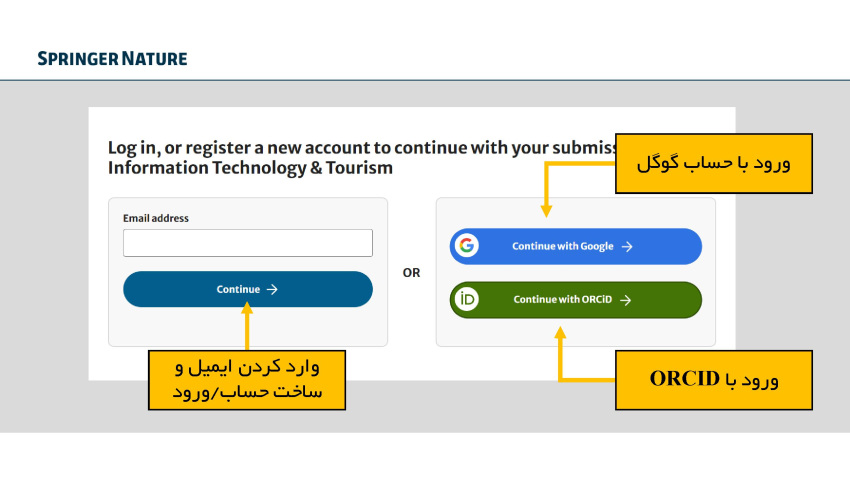 در صفحه جدید، سیستم از نویسنده میخواهد برای ادامه، وارد حساب Springer Nature شود. سه روش ورود وجود دارد: