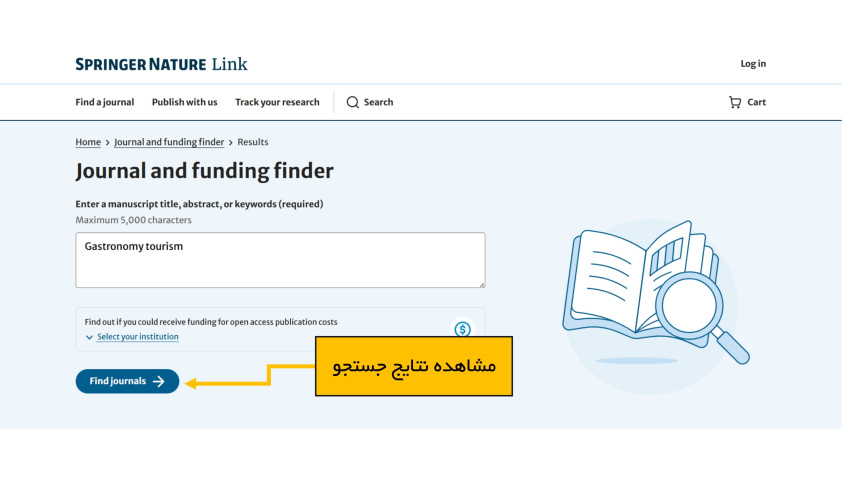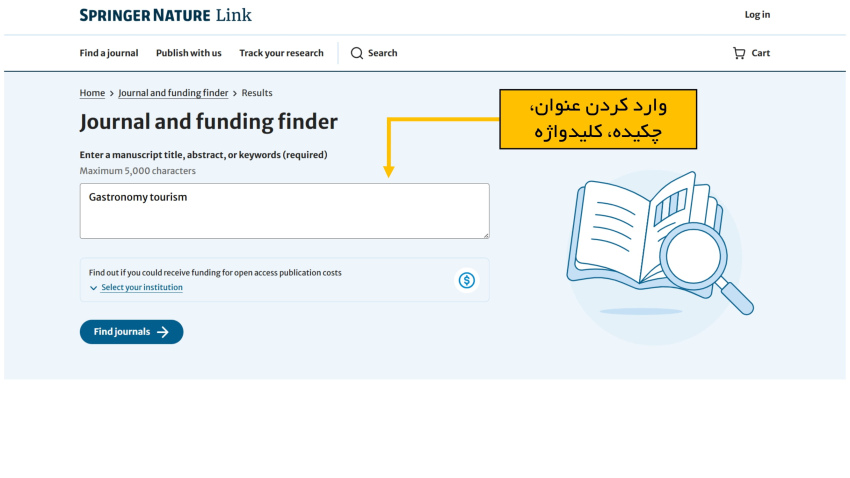 کاربر پس از ورود به صفحه، از بخش Find a Journal وارد ابزار Journal & Funding Finder میشود. این ابزار برای یافتن ژورنالهای مرتبط و بررسی امکان تأمین هزینه چاپ (APC) طراحی شده است.